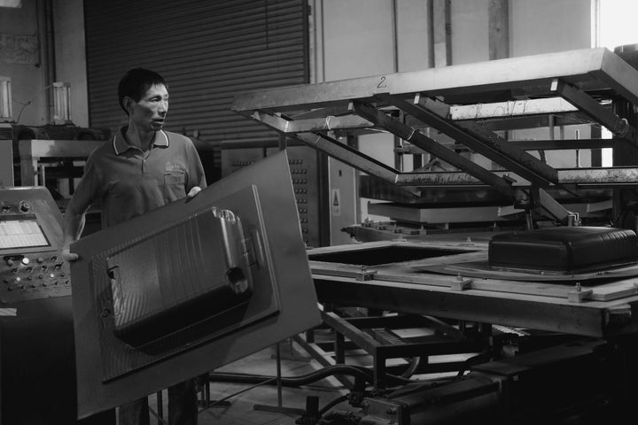 An operator removes a freshly formed Monos shell from a vacuum forming machine.