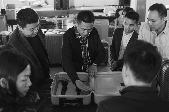 Colin – our main factory’s CEO and a seasoned industry veteran – personally inspects a finished Monos Carry-On with the production managers.