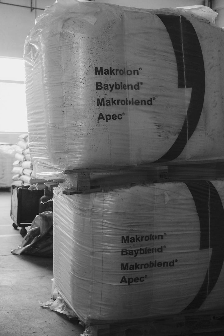 Raw Makrolon polycarbonate resin before it is melted, coloured, and extruded into sheets.